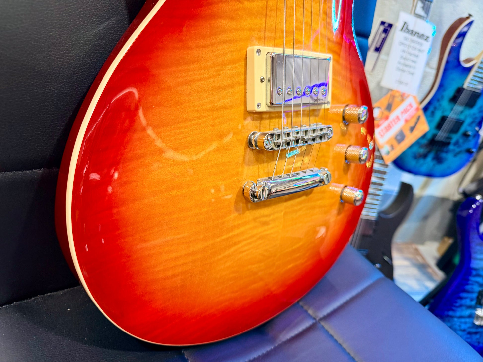 Finished in stunning cherry sunburst, this LP shape guitar would make the perfect starter or backup guitar for the experienced musician. These are exceptional guitars for under £200 and cannot be rivalled on quality for this price.