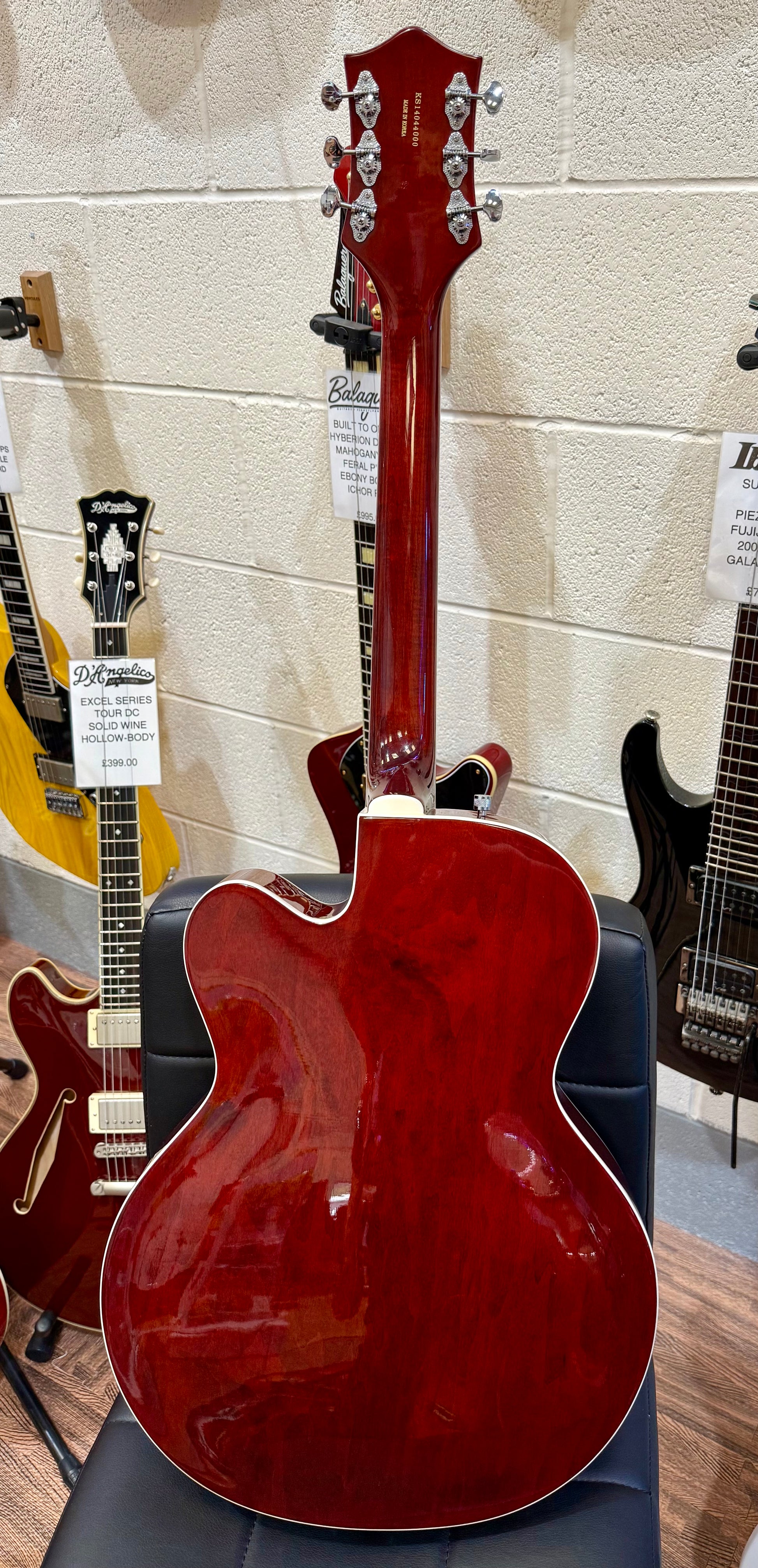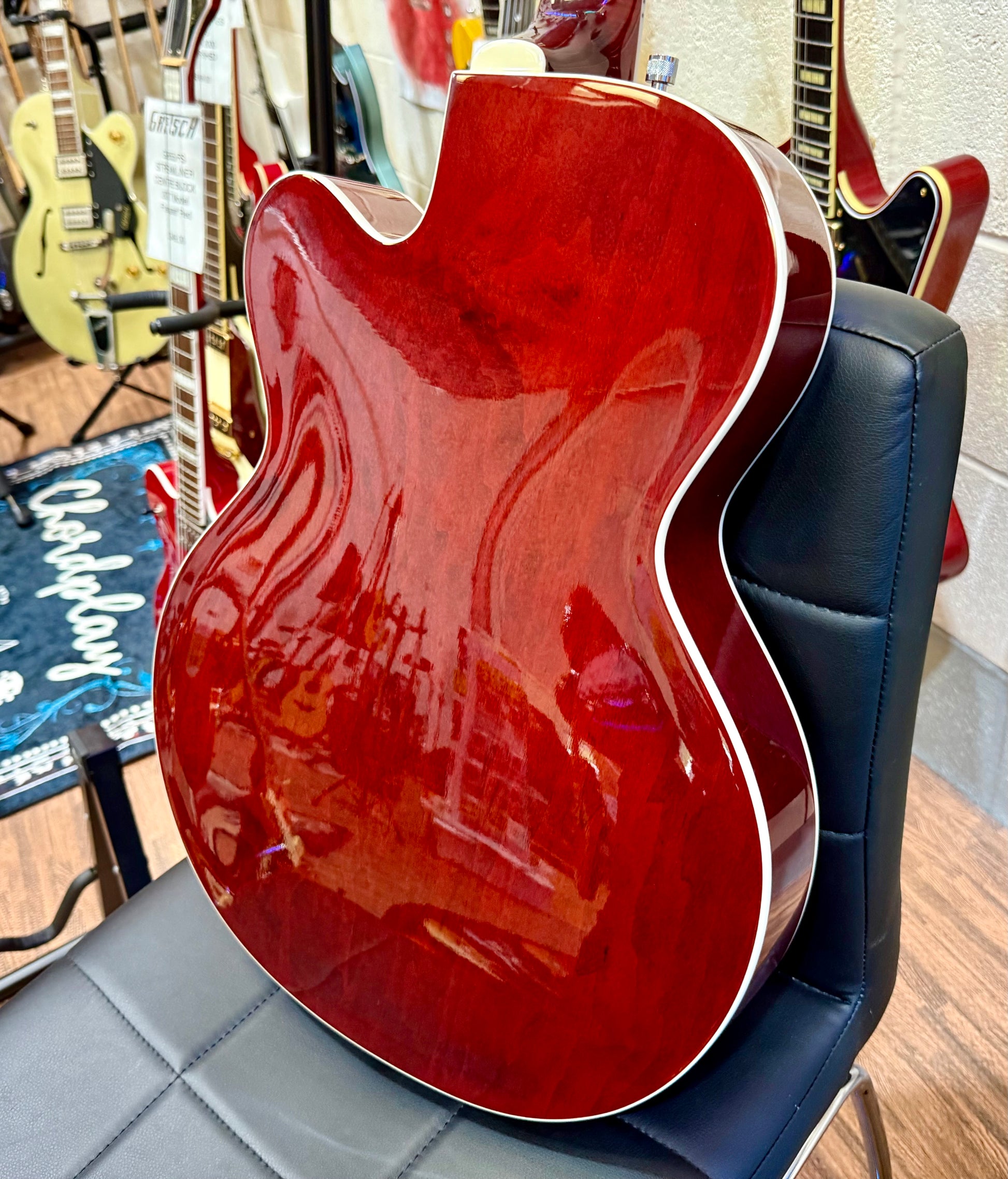 It features a 5-ply Maple body with elegant bound f-holes, a comfortable slim-medium Maple neck with Rosewood fingerboard, medium jumbo frets, and hump block pearloid inlays. Finally an Adjusto-Matic bridge, Bigsby B60 vibrato tailpiece, ‘G’ arrow controls, vintage-style open back tuners and chrome hardware.