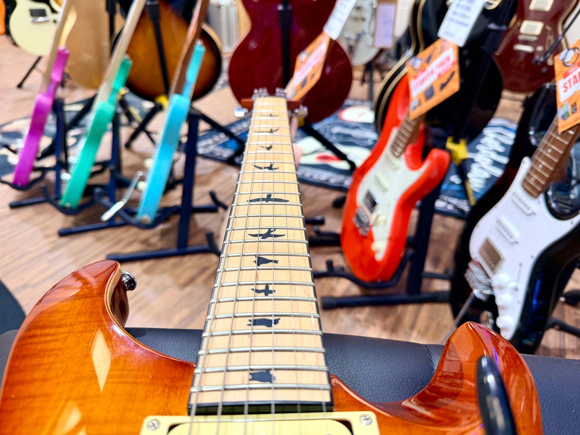 Like many guitars from PRS, the attention to detail featured on the maple fingerboard is simply eye-catching, featuring a selection of birds which make up PRS’ iconic inlays. The bird inlays include representations of the following species; peregrine falcon (3rd fret), marsh hawk (5th fret), ruby throated hummingbird (7th fret), common tern (9th fret), Coopers hawk (12th fret), kite (15th fret), sparrow (17th fret), storm petrel (19th fret), and a landing hawk (21st fret).