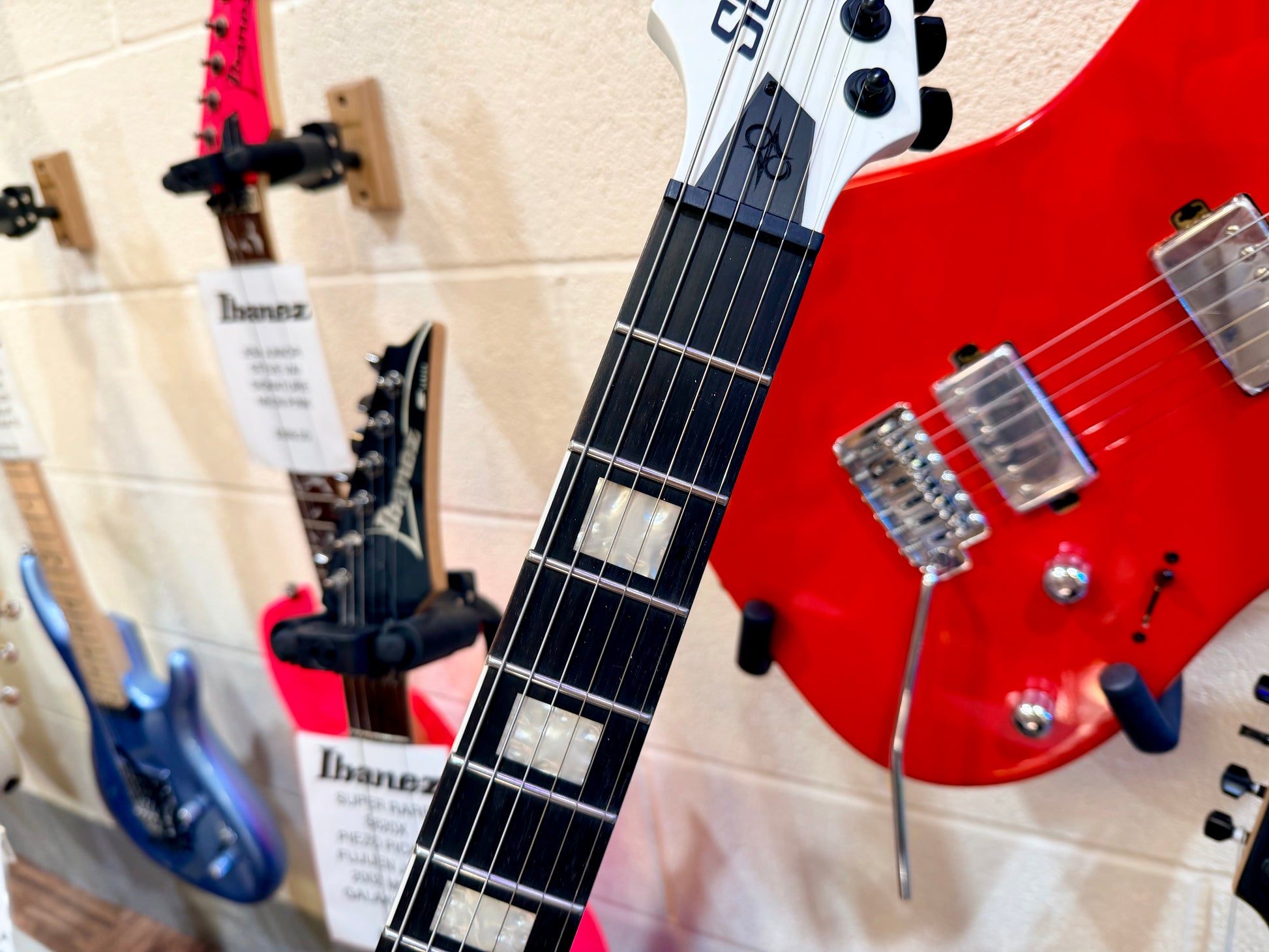 And the E1.6KW is all white, all angles and sharp edges, making for a state-of-the-art EX-style with a single EMG-81 humbucker for putting meat on Windstein's sludge riffs