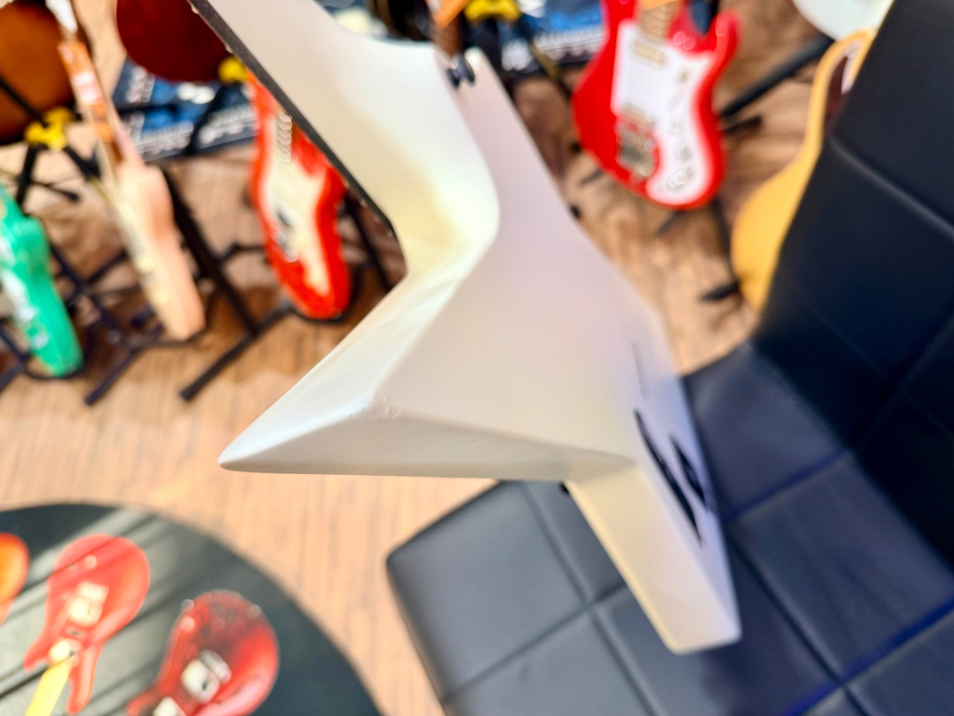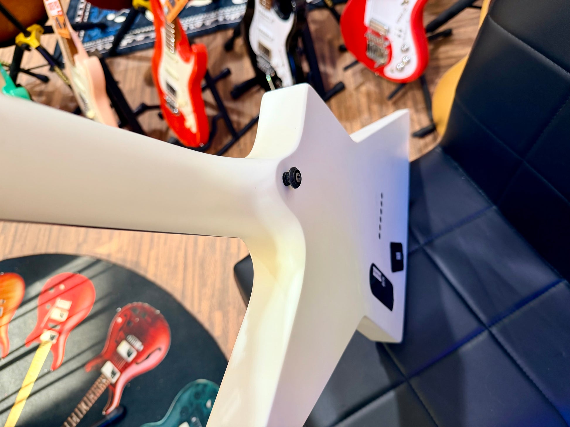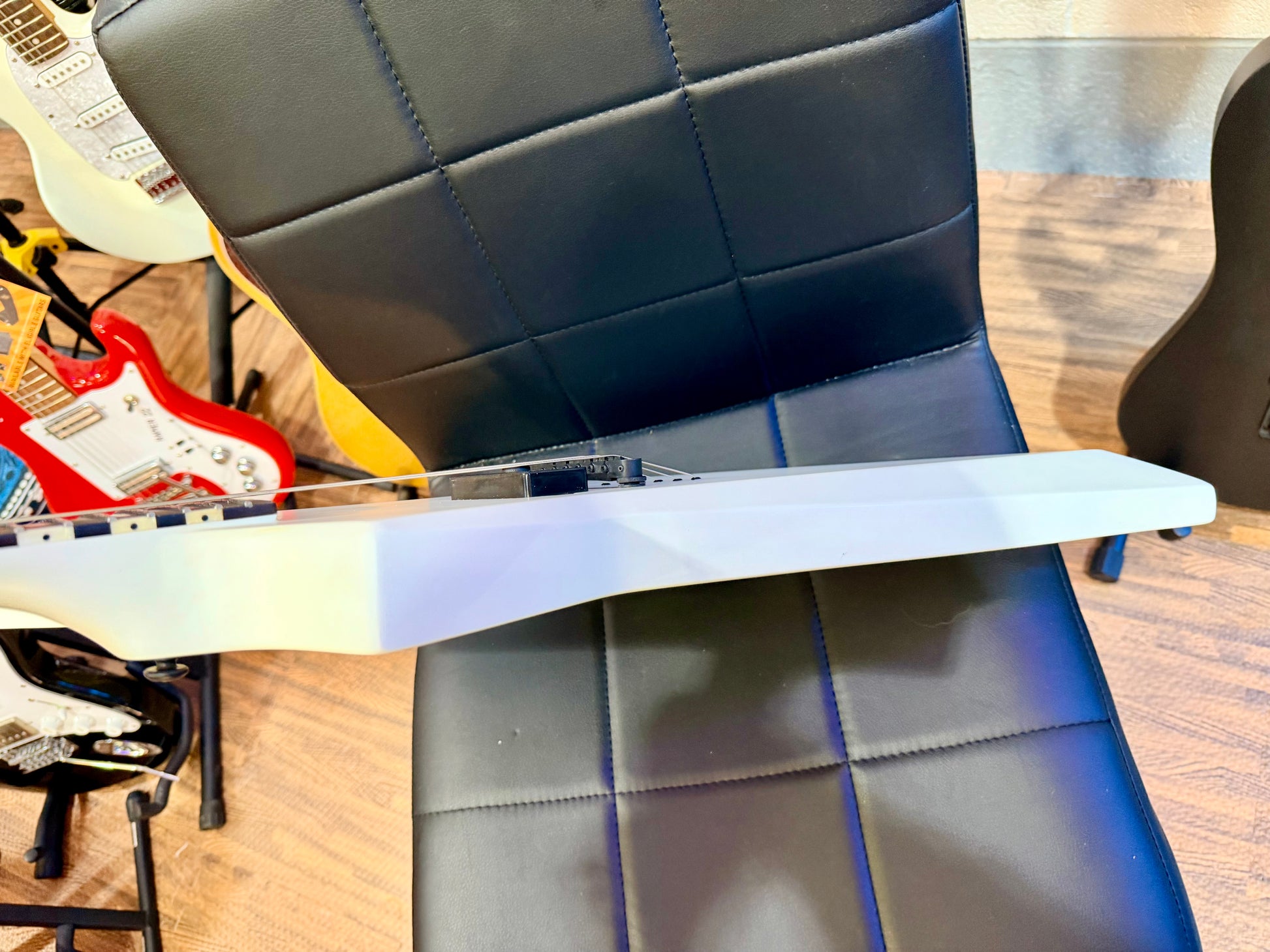 Windstein’s E1.6KW is a riffer’s guitar, a single-pickup electric, finished in White Matte, with a reverse headstock you could use as a harpoon.